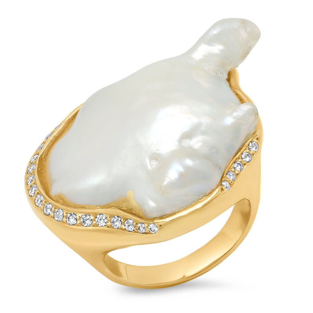 ["Baroque Pearl Cocktail ring","Baroque Pearl Slice Ring","Cocktail","diamonds","Fine Jewelry","LS","online ring","online rings","p-1948","pearl ring","RGP-16","ring","samira 13","statement","White Baroque Fresh Water Pearl Slice 18k Diamond Ring Yellow Gold","Yellow Gold"]