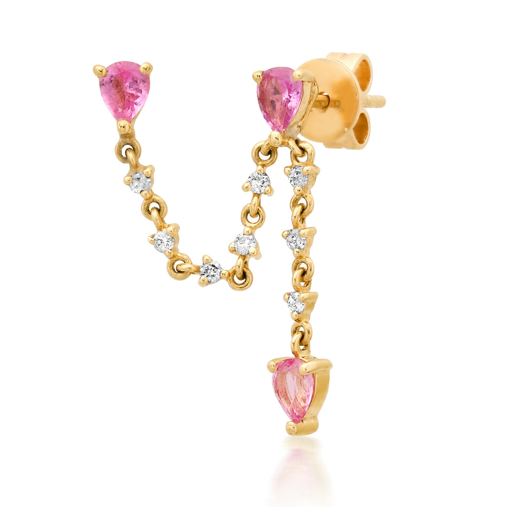 Triple Pink Sapphire + Diamond Chain Single Side Stud Earring