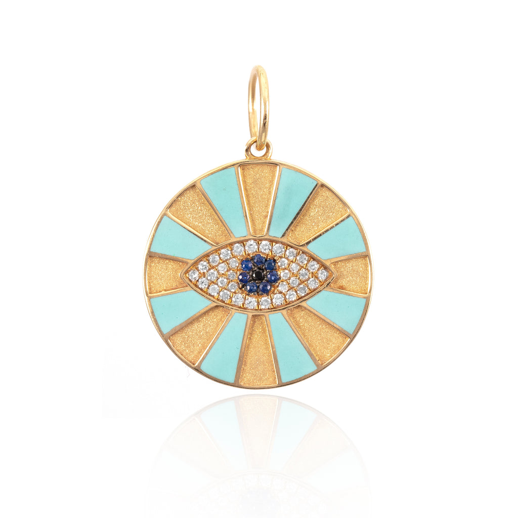 ["Blue Sapphire Diamond Evil Eye Turquoise Enamel Sun Ray Disk Charm","charms and pendants","Evil eye","giftguide","Make your Own","NK Online","NP-405","Online Charm","online necklace","P-3858","pendants and charms","Turquoise Enamel","world design"]